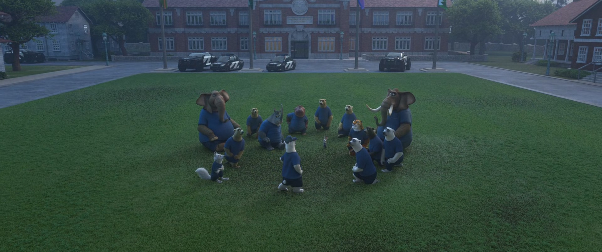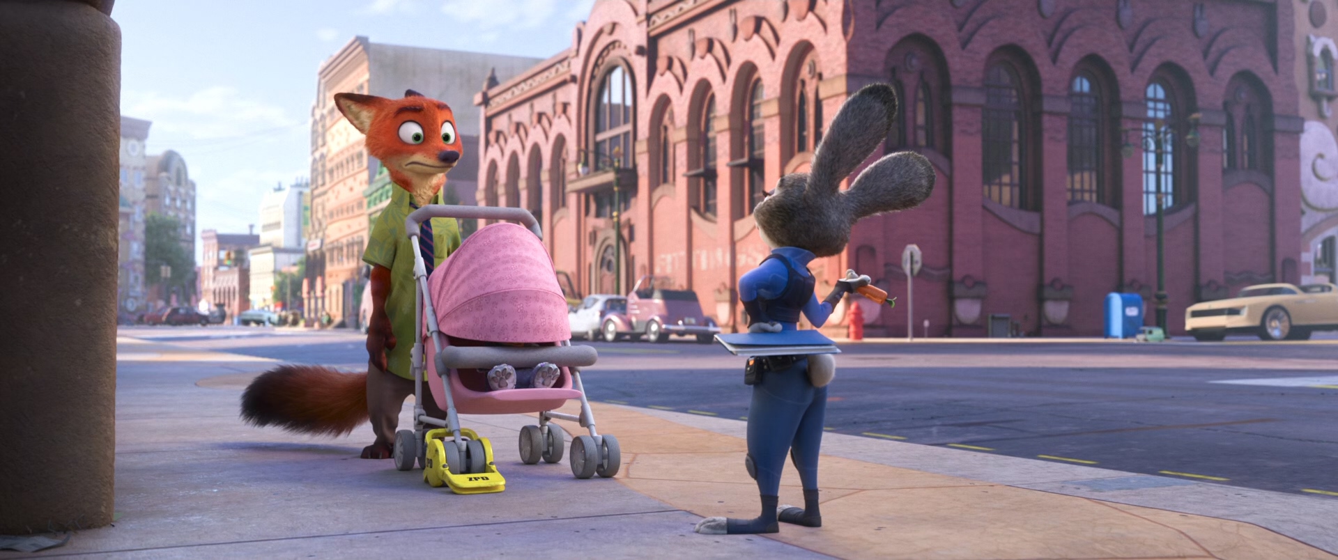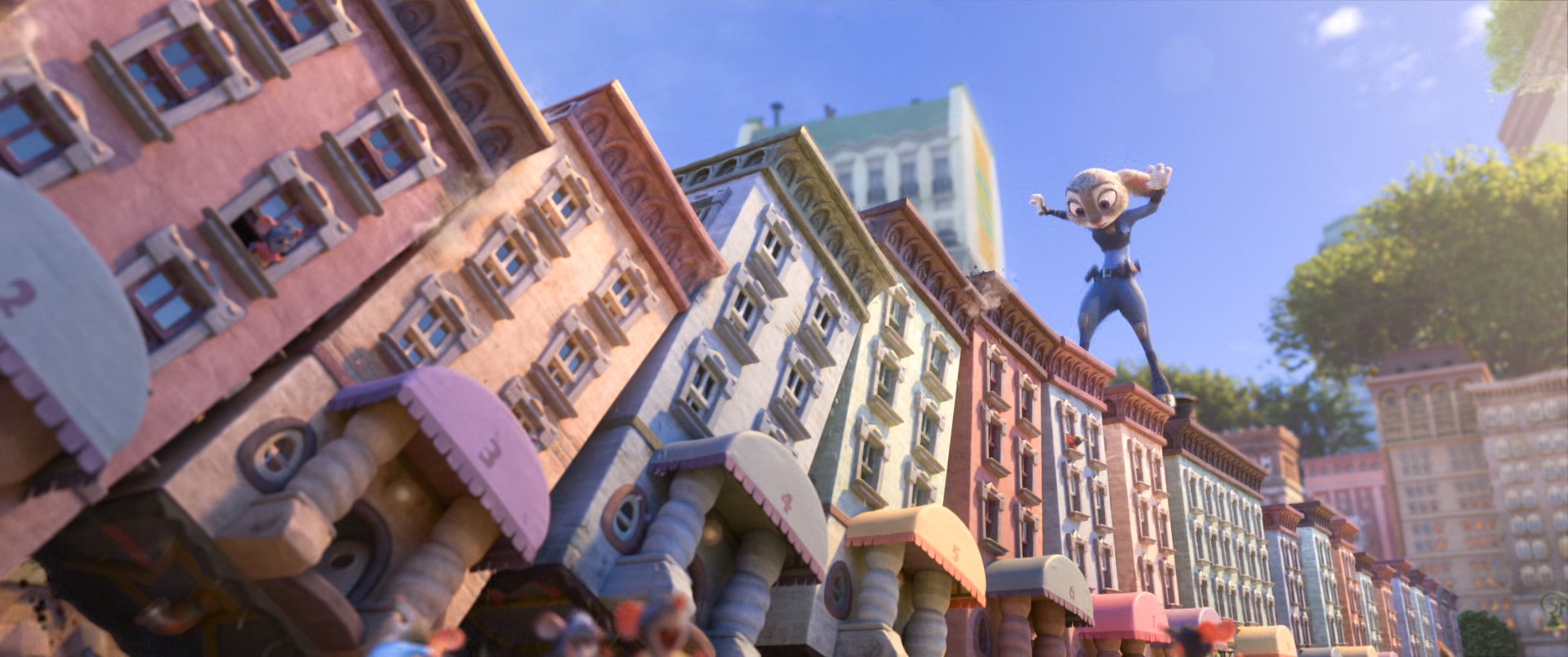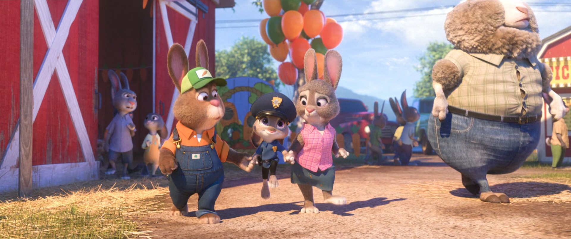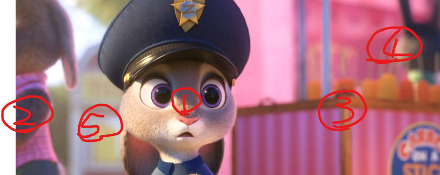 컬러 배치는 항상 공부해야 되고 중요한 핵심인데 씬의 전체적인 콘셉트가 하의는 전체적으로 푸른색 하의이다. 그래서 극을 이끌어 나가야 되는 주디 가족들에게 조금 강한 채도와 색상의 상의를 세팅하였는데 다른 엑스트라들의 상의는 상대적으로 낮은 채도의 컬러를 넣으며 차이를 준 지점 또한 생각해봐야 될 부분이다. 연출상에서 덕분에 채도 강한 풍선이 눈에 띌 가능성 때문에 뒤편의 동선을 건물 그림자쪽으로 잡은것 또한 이러한 핵심 연출에 의해 보조하는 부분
