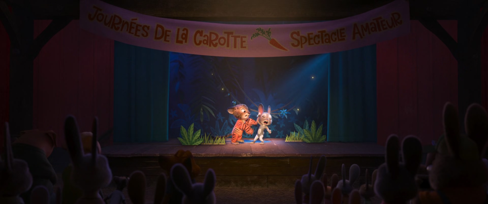 첫 단락에서도 말했지만 연극이 끝나고 주인공인 주디를 중심으로 이어져야 하기 때문에 주디에게 시선 포인트를 줄 모든 연출을 감안해야만 한다. 첫 번째 관객들이 전경에 배치되어 있는 풀샷과 같은 경우도 단순히 전경 배치로 끝내는 게 아니라 추가로 소실점이 느껴지도록 구도를 잡는 것은 물론 아래와 같이 양쪽으로 좀 더 림 밝기를 추가하거나 방향을 잡아주는 디테일도 체크해야 한다.