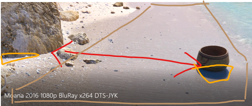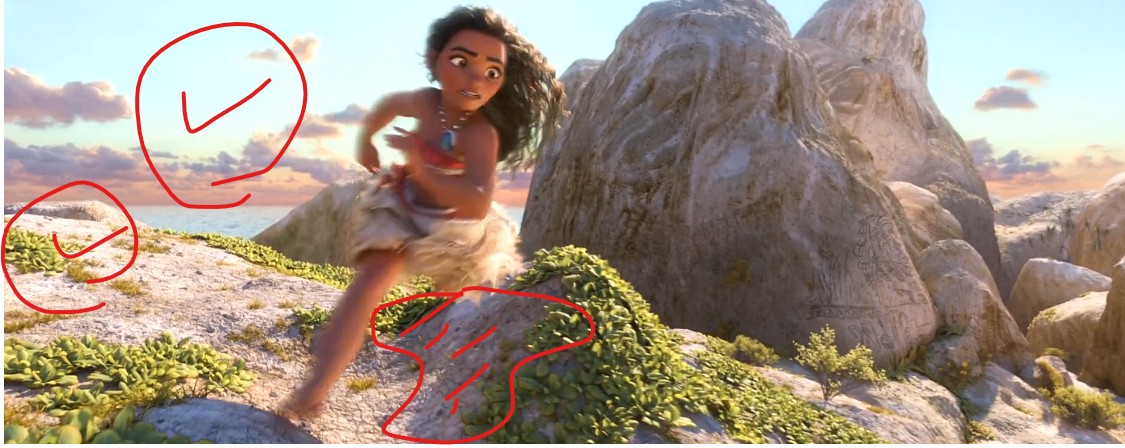 모아나는 한컷한컷 신경쓴 포인트가 엄청나게 많다 애기거북이가 움직이는 이 두컷만 보더라도 큰 야자수잎 그림자를 통과해서 가게되는데 아래컷을 보면 알수있지만 기본적으로 초록색 나뭇잎의 그림자는 바운스라이트와cg에서 그대로 쓴다면 gi에 의해 초록색그림자가 묻어나오는게 계산일껀데 색톤과 그림자페더값을 강제적으로 연출하여 옐로우 계열의 보색인 바이올렛으로 색조합을 맞춘것으로 보인다