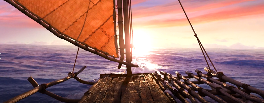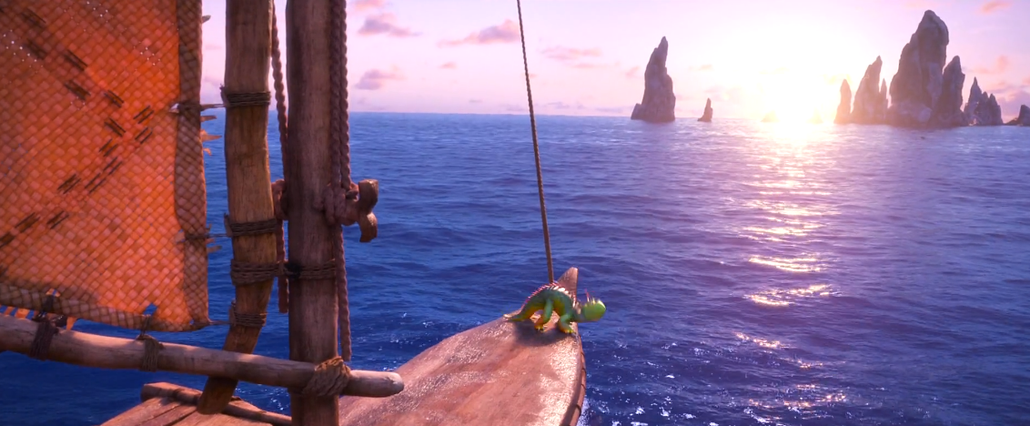 전 컷에 비해 시간이 어느정도 흘렀다라는걸 표현하기 위해 전체적으로 대비값과 강한 Y노멀(Y는 평범하지않아 외우자) 의 벨류값이 줄어들었고 그림자의 방향 또한 옅어지기 시작했다. 미묘하게 시간때가 바뀌었다라는걸 노린거 같은데 모아나에 맺히는 키샷의 그림자방향 또한 측광에서 들어오기 시작했으며 원경의 매트이미지도 선셋의 매트로 바뀌고 있다.(독한 넘들 절래절래) 하지만 여전히 원경의 포커스는 최소한으로 유지하여 망망대해의 같은 공간의 섬이라는건 유지하는듯 싶다.