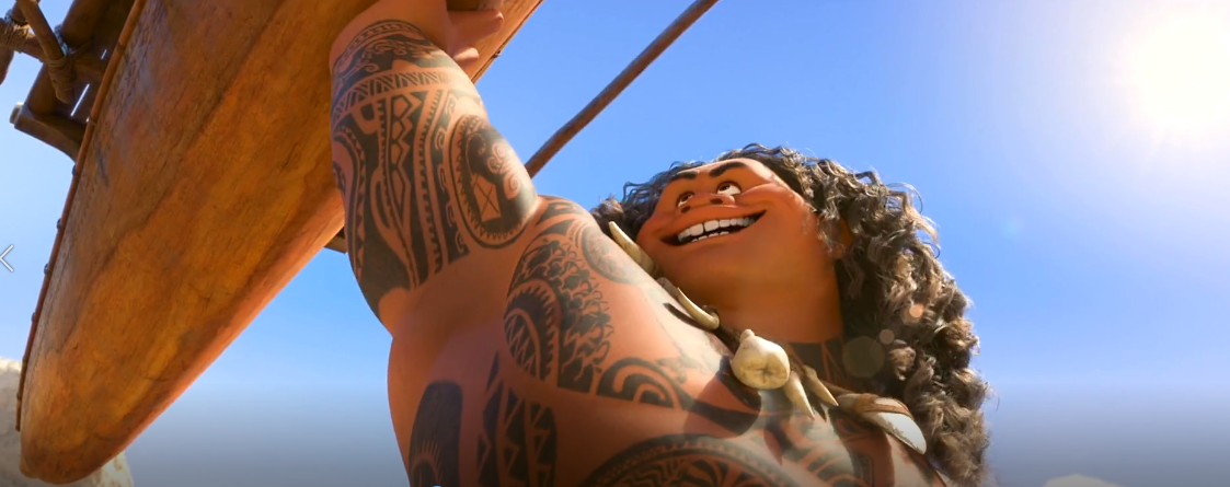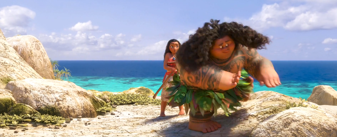 모아나의 기본베이스는 섬과 폴리네시아사람들 그리고 태평양이다 적도의 강한 태양빛과 푸른 망망대해 여기에 기존에 본적 없던 캐릭터들 두 주인공의 전신타투에서 비롯한 의상과 헤어 피부의 개성은 어디서 본적 없는 비쥬얼을 보여주었다.