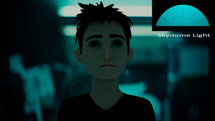 캐릭터는 주변광이 연한 연한 파란색/녹색을 띠는 곳에 있습니다. Skydome Light를 사용하여 3D로 추가해 보겠습니다. 이 조명은 캐릭터를 둘러싸며 단색을 띕니다.