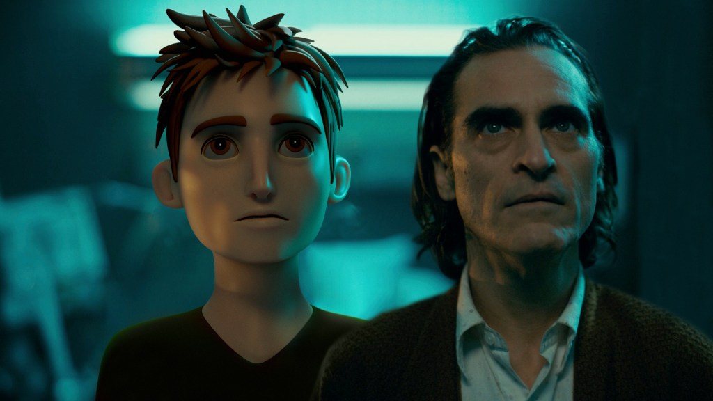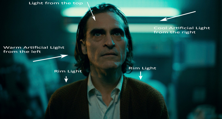 왼쪽의 따뜻한 빛 모양이 조커의 머리 형태와 목의 빛을 자르는 셔츠 칼라와 연결되어 있더라도 여전히 캐릭터에 그대로 유지하고 빛이 투사된 패턴에서 나오는 것처럼 가장할 수 있습니다.